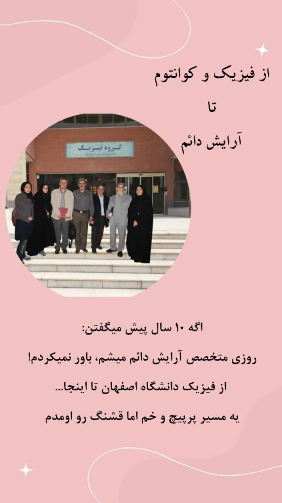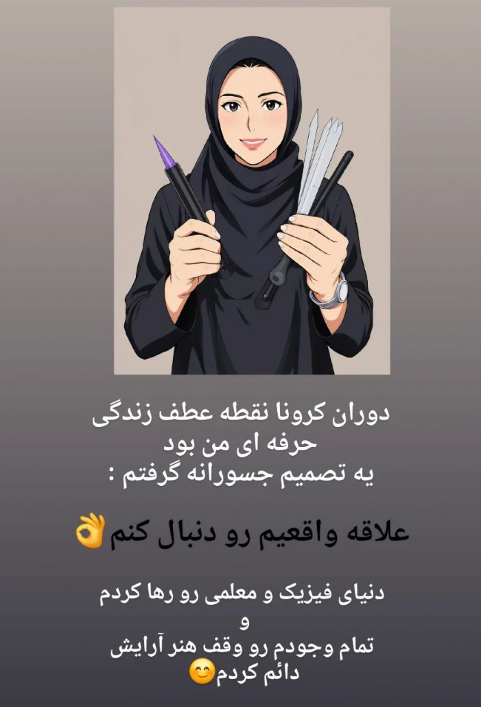 بعد از پایان تحصیلاتم ، معلم شدم ولی بعد چند سال، وارد رشته و هنر آرایش دائم شدم و چون به هنر علاقه دارم و از طرفی دقتم تو کار بالا هست، تونستم به سرعت پیشرفت کنم .